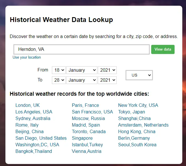 - Enter in your location and date range for the past weather you wish to see.