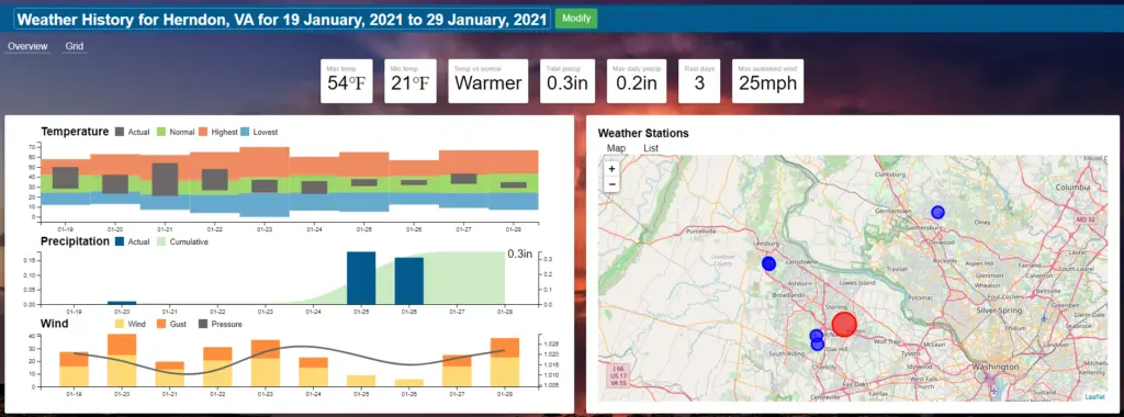 Here you can see the result for a range of past weather data for Temperature, Precipitation and Wind as well as a high, low and average values.