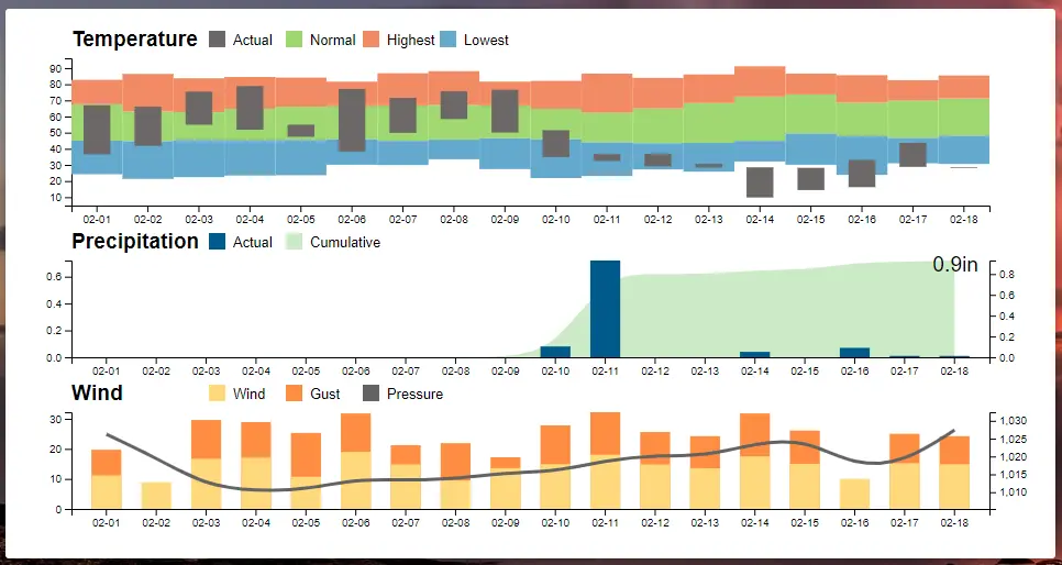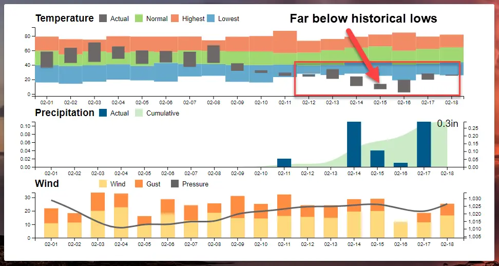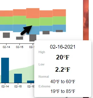 Simply moving your mouse over the coldest date which appears to be 2/16/2021, we can see that the temp values for that date as well as the historical extremes: