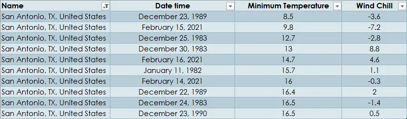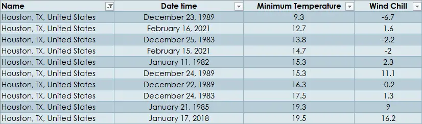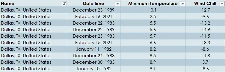 Here are the top 10 coldest weather events we found for the 3 cities that we discussed above: