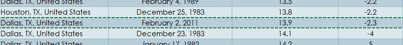 So now that we know that this was the coldest storm in 10 years, one of the looming questions is whether this is the coldest ever in recent history? Should the power companies have anticipated or at least prepared for such an event as a possible emergency scenario? Let’s look. We have downloaded the raw data and requested data from as far back as 1980, we loaded this data (CSV format) into Excel and then sorted it by lowest temperature value for each of the cities.
