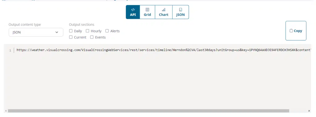 The Visual Crossing Weather API includes an easy way to build weather API queries via the Weather Data Services Page. On this page we can create a query for the weather forecast, historical weather observations and also historical climate summaries.