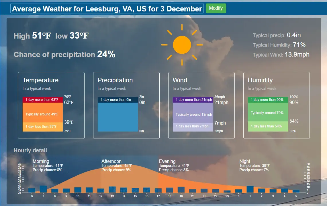 In contrast, historical weather averages—or climatology—are based on 30+ years of past weather data for a given date and location. These averages tell you what normally happens on, say, February 14th in Herndon, VA.