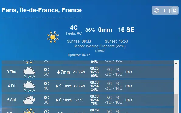 For the sake of practical comparison, here is a weather forecast screenshot taken from the Visual Crossing Weather Data Query page.