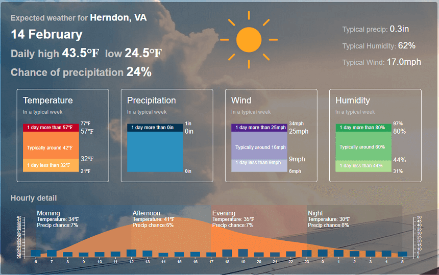 In contrast, historical weather averages—or climatology—are based on 30+ years of past weather data for a given date and location. These averages tell you what normally happens on, say, February 14th in Herndon, VA.