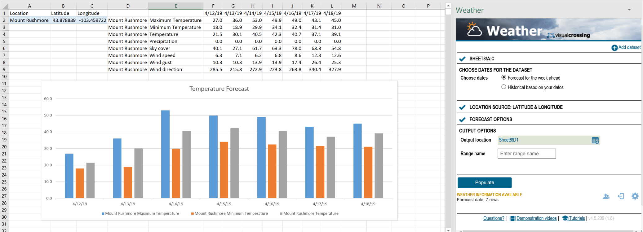 In order to obtain the forecast, I copied a single row from my Mount Rushmore historical data and pasted it into a new sheet. Then I selected the latitude and longitude and let Visual Crossing Weather populate the weather details for the week ahead.