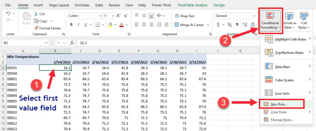 Start by selecting our first value cell for minimum temperature. Next we will open the ‘Conditional Formatting’ menu on the ribbon bar and select ‘New Rule…’.