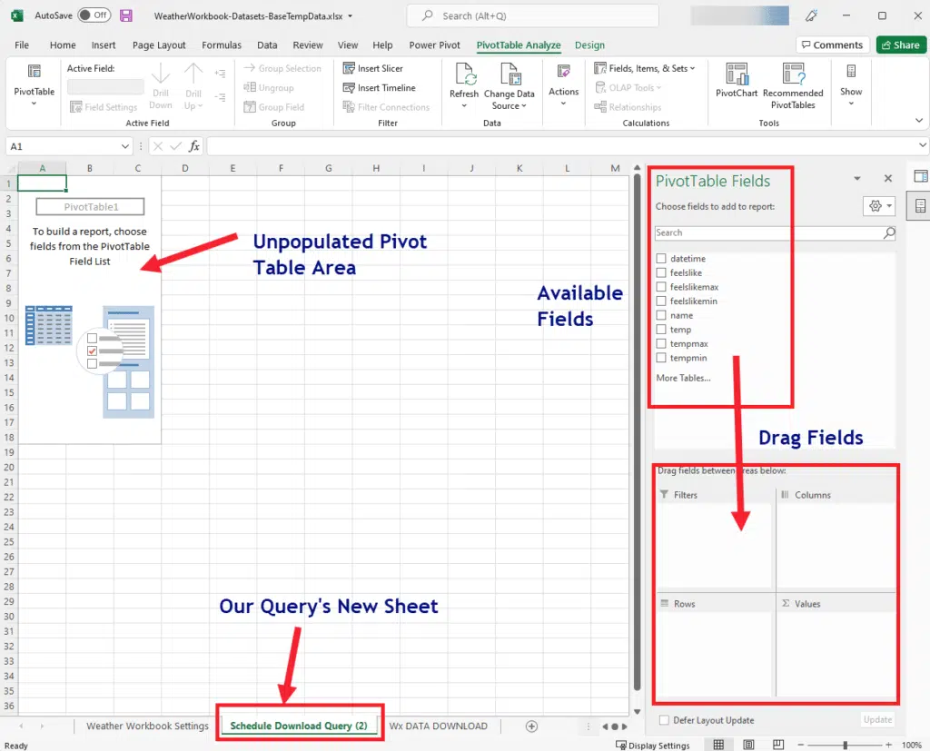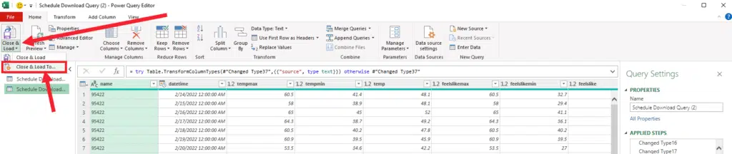 Now that we have a fully working query, we are going to make a copy of it but we are going to begin to build our calendar of locations and dates by emptying our data into a Pivot Table to make it easier to read and format. This will make us more efficient in identifying parts of the US that will freeze in the coming week.