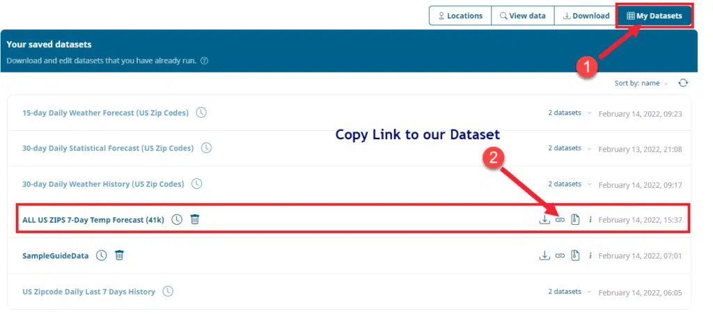 The first step is to set up and build the forecast dataset that you will need. In our example we are going to take on a larger project and use one of the standard datasets that are available to our Corporate Licensed Customers as a standard bulk dataset. It is a forecast weather query for all us zip codes. This way, regardless of how many areas we will ship to, we can cover the whole US and simply avoid shipments to these areas. For your use case you may wish to start smaller and build a query with a handful of locations. If you are new to building saved and scheduled datasets, please follow this tutorial: