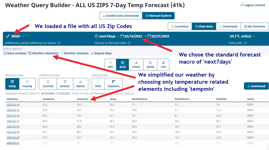 There are many customizations that can be done to this workbook to tailor it to your needs but what we have given you here is a budget-friendly way to retrieve freeze data and analyze a week of forecast for thousands of locations. If your license allows, you can simply set up your dataset as a schedule and use the ‘Refresh All’ option under the ‘Data’ menu to update your Excel data to grab the latest dataset from the server.