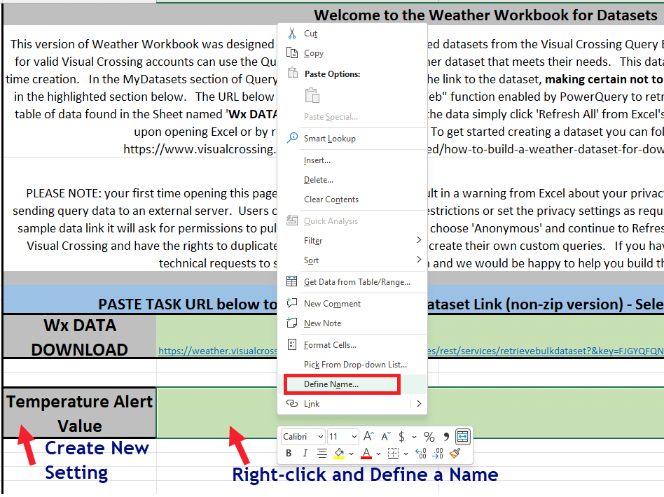 Start by creating a pair of cells similar to our ‘Wx DATA DOWNLOAD’ entry area. One column is just a friendly name and the green section will be our actual data section. Once you create the green cell, right-click and select ‘Define Name…’. This will allow us to name this area and read that value from anywhere in our workbook.