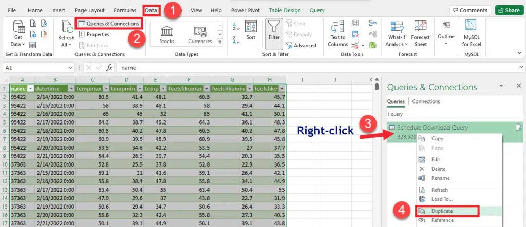 As seen below, navigate to the Data menu in Excel and open the ‘Queries & Connections’ editor which will open in the right sidebar. Then right click on our query and choose ‘Duplicate’.