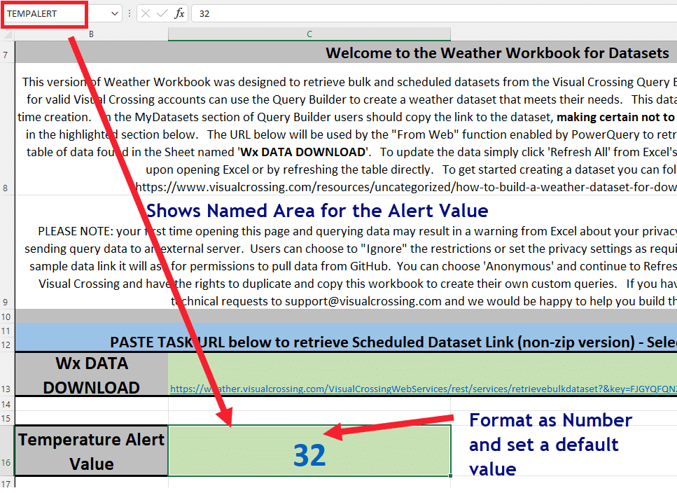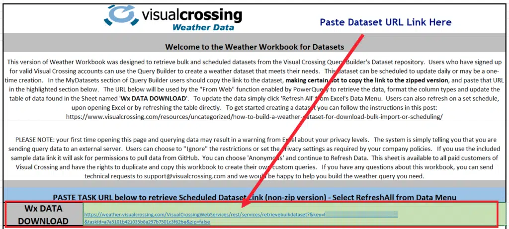 The string URL link is now in our copy-paste buffer. Now open Weather Workbook and paste in our link into the green highlighted area replacing the link that is currently there.