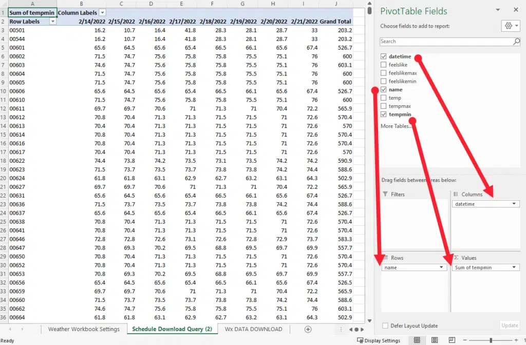 When we drag the data to the appropriate areas we will see our data. We put ‘name’ in the rows (this is just our location name which is our zip codes), we put ‘datetime’ in the columns and finally we put tempmin into the ‘Values’ area. NOTE: If we add a second value to this area a special ‘Values’ placeholder will appear and should be placed on the rows.