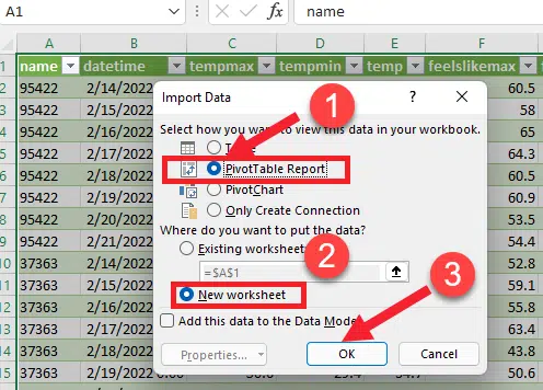 For this excercise we are going to use the ‘PivotTable Report’ in a new worksheet and click ‘OK’ to finish.