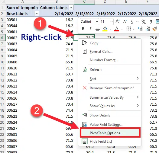 One key item we need to do is to select the ‘Sum of tempmin’ field in the ‘Values’ area to define the aggregation of our min temperature value and name it.