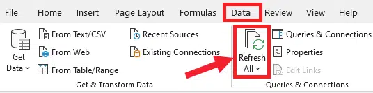 We can now navigate to the Data menu in Excel and choose ‘Refresh All’.