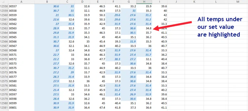 It is a bit complex but just note that the rule will color the cell in our data when values are less than or equal to our value set in the ‘TEMPALERT’ area.