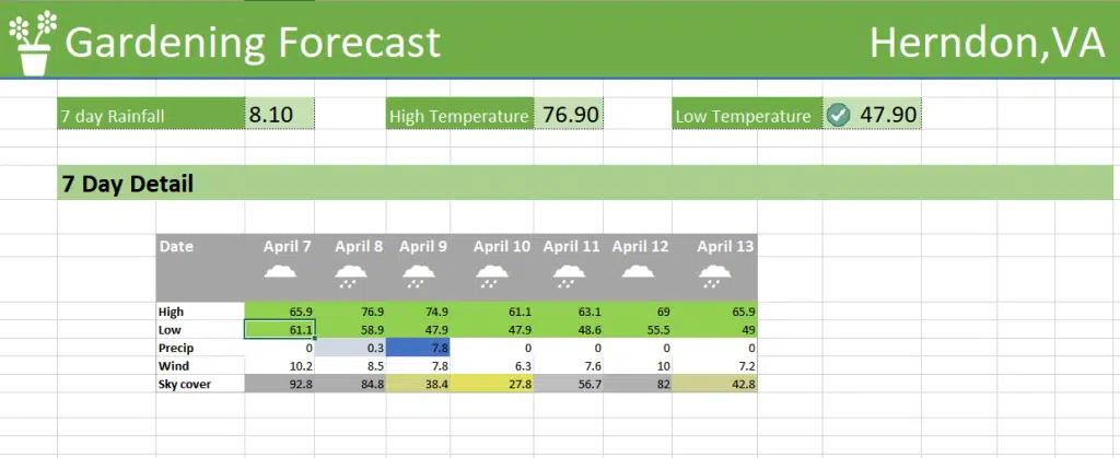 We can see that creating a weather forecast summary is very straightforward. Simply bring in the weather forecast data using an external provider such as Visual Crossing’s Weather Add-in and then create a formatted forecast table. In our case we also extracted some of the key aspects of the weather forecast that a gardener would like to see.