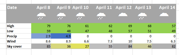 Each of these are simply references to the raw forecast weather table. In addition, we then added conditional formatting to help highlight days that are hot, cold or when rain expected.
