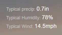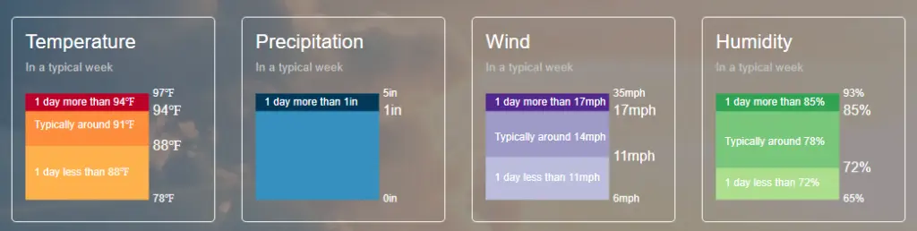 The box to the right will give you your typical daily statistics for Precipitation, Wind and Humidity. We are seeing high humidity, a decent wind to cool things off but the rain is non-trivial. Let’s look at more detailed breakdowns of a typical week to help us understand what we can really expect.