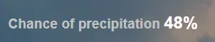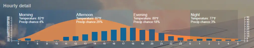 Over our statistical 24 hour period, we can see from the orange colored fill graph that we reach maximum temperature at 1 or 2PM. We can also see from the blue bar graphs that most of the rain during the analyzed period occurs typically in the late afternoon or evening. This is incredibly helpful for our planning purposes!
