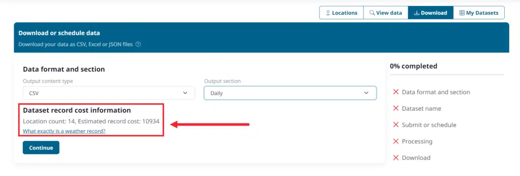One item that we will highlight here is that you can build your exact weather query in Query Builder, see a sample of the data, sample output formats, the API query string, and, most importantly for our topic is you can see the cost before you download. Here we have a 14-location sample for random dates over multiple years with daily data: