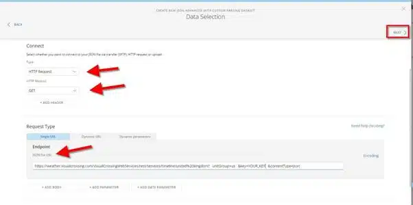 - Naming: Name your DataSet (e.g., “Visual Crossing – Daily Forecast”).