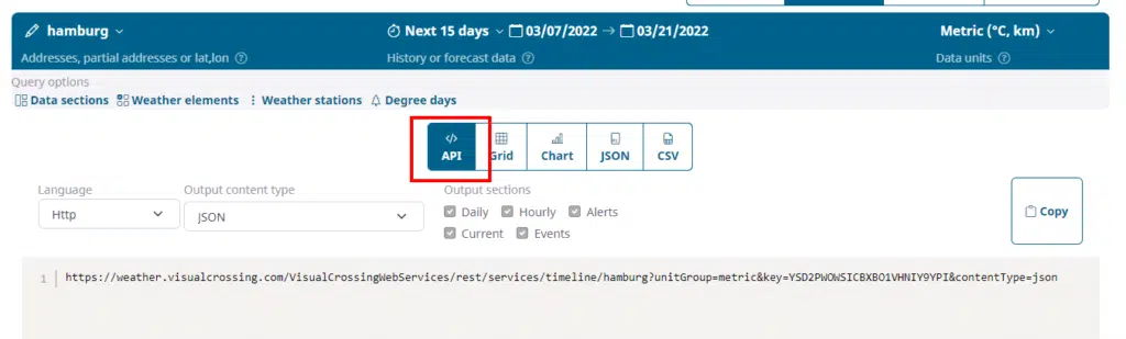 you will find the API query string under the ‘</> API’ tab