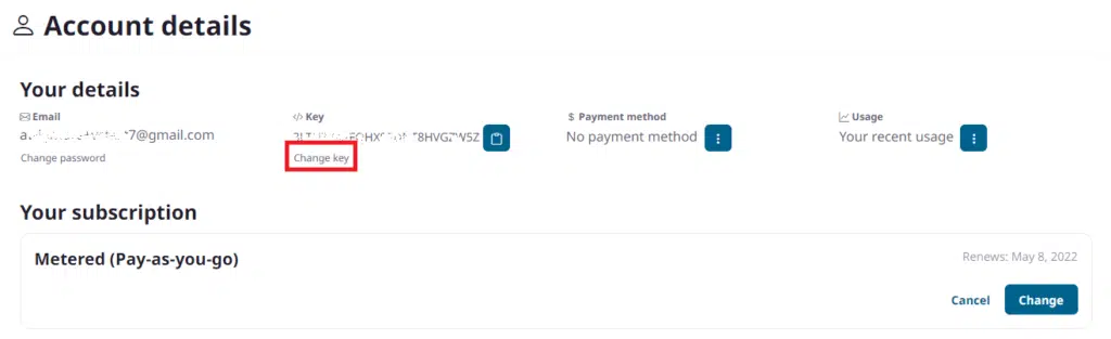You must confirm that you want to change the API key. The change to the key will be immediate.
