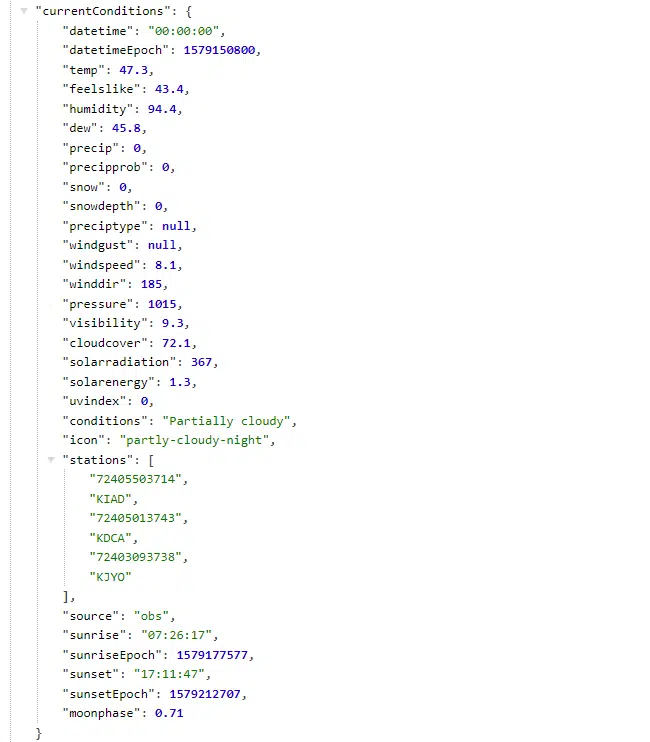 https://weather.visualcrossing.com/VisualCrossingWebServices/rest/services/timeline/38.94800,C-77.30635/2020-01-16T00:11:00?unitGroup=us&key=YOUR_API_KEY&contentType=json&include=current