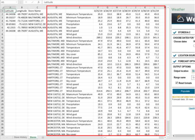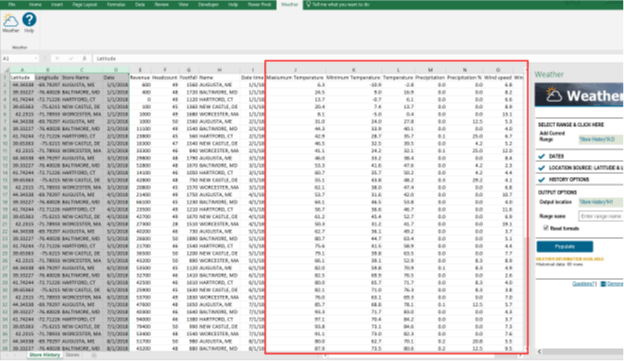 Now that the data has been selected and options populated, you can click the Populate button at the bottom of the Weather panel. This will cause several new columns to be added to the right of the existing sheet data. These columns contain the weather at the specified locations (given by the latitude/longitude) and on the specified dates. You will see variables such as Temperature, Precipitation, and Wind speed. (Note that you can use the options on the Weather panel to change the output location if you wish.)