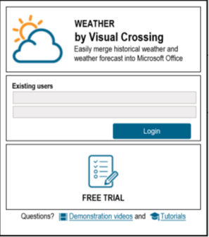 You will now need to log into Visual Crossing Weather. The first step is to click on the Weather icon shown above. The Weather panel will open on the right-hand side of your Excel sheet. You will then see a login box as shown below. If you already have a Visual Crossing account, you can enter the appropriate login and password. If not, click on the Free Trial button and walk through the process of signing up for your free trial account.