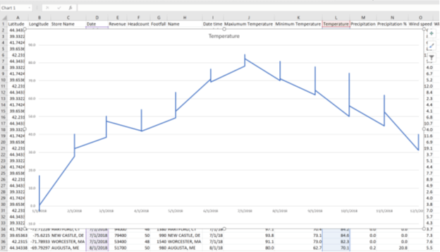 You can now use the power of Excel’s rich analysis functionality to analyze the weather events at the given locations. For example, below is a simple graph that shows how the temperature changes at the locations throughout the year. You can obtain it simply by selecting the date and temperature column and inserting a line graph. The analysis possibilities are limitless.