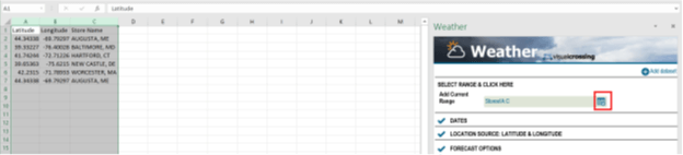 Once you have selected those columns, press the Select Range button in the Weather tab.