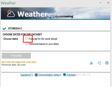 As before, this will cause Visual Crossing Weather to analyze the data and select the appropriate options. However, in this case, there is no date on our data, so Visual Crossing does not know if you want to do an historical analysis or a forecast. Thus, the Weather panel prompts us to choose. Simply select the radio button for “Forecast for the week ahead” since we are interested in forecast data analysis now.