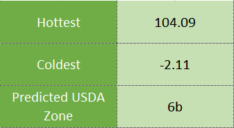 The calculated USDA Hardiness Zone – based on the average low temperature, this is a standard measure of plant cold weather hardiness issued by the United States USDA.