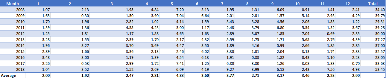 Here we see the amounts of precipitation for each month for the past 10 years. As gardeners we look at the average amount of rainfall in a month. The extreme values can be useful for planning and mitigation for extreme rainfall events or for identifying any risk of drought. In this example you can see that 2016 was a particularly dry year and 2018 was an extremely wet year.