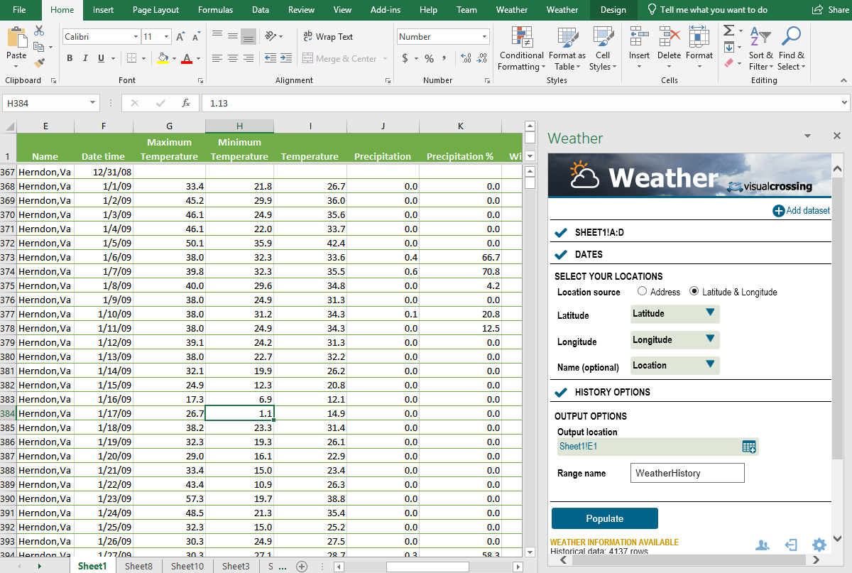 To start the dashboard, we need to import historical weather data for the locations we are interested in. To do this, we are using the Visual Crossing Weather add-in. This add-in makes it easy for us to import historical weather records and weather forecast data into Excel, so we can perform the data analysis.