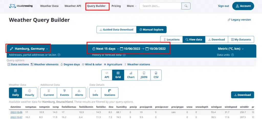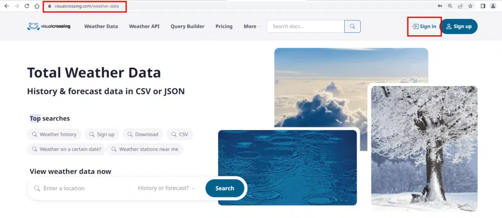 We’ll start by going to the Visual Crossing Weather Data page. We then need to click on the link to go to weather data download page near the top of the page.