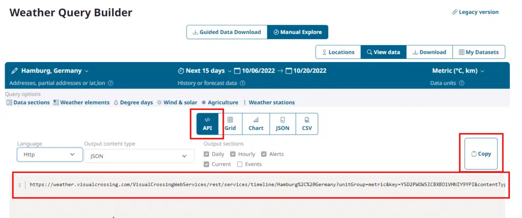 Where the “<URL>” is the value the we copied from the Visual Crossing Weather API page.