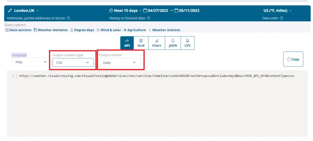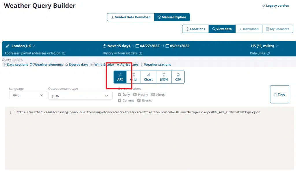 However, we’ll switch to the API view to generate the query URL. Using a query URL will allow us to directly import our live weather forecast data into Power BI. This query will allow Power BI to fetch live data and refresh the data so that our forecast data is always current.
