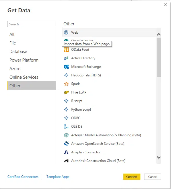 Click on ‘Get data from another source’ to popup the connector dialog. From this dialog, click on ‘Other’ then ‘Web’.