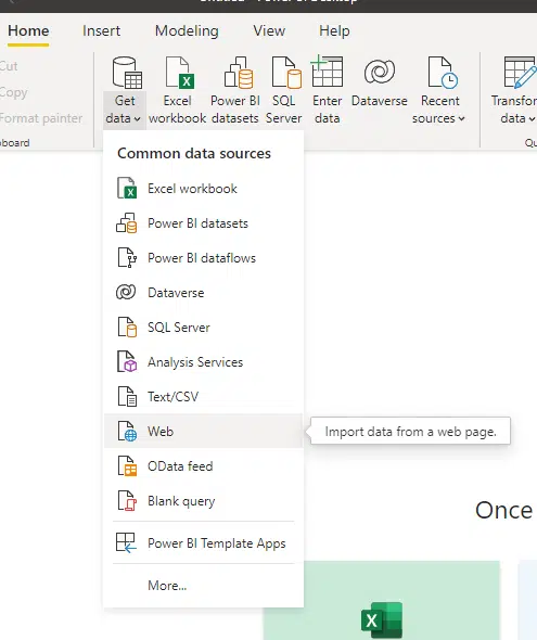 Alternatively, you can access the Get Data -> Web from the toolbar by clicking ‘Get Data’ and then web.