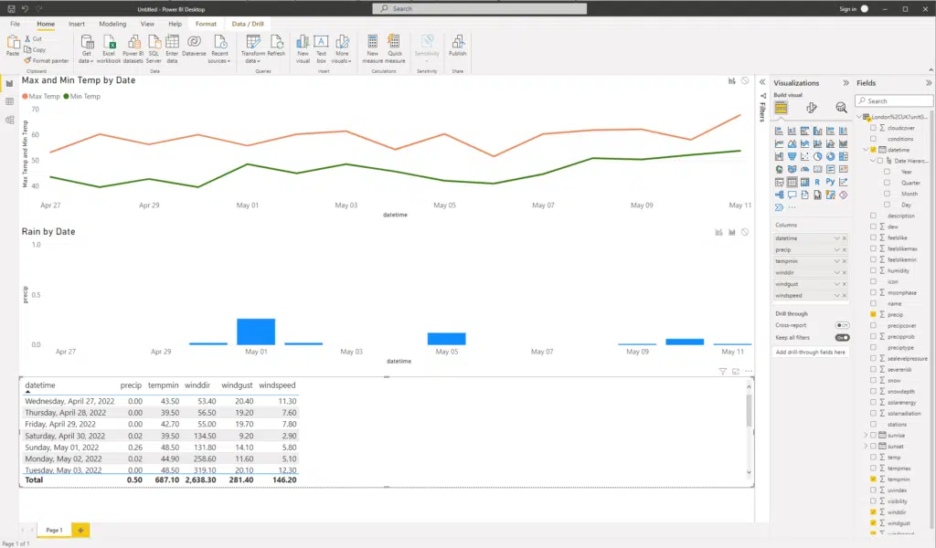 In the above steps, we integrated a live weather API request into the Power BI document. In some cases, it is preferable to import data from a scheduled dataset rather than a live weather API query. The data format will be the same and so integration is just as easy. Scheduled queries are particularly useful when you need data for many locations as the schedule will run the data for all the locations. For more information on using scheduled queries, please see How to schedule weather queries.
