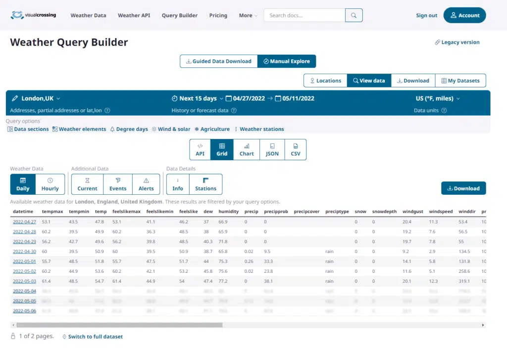 We’ll start by going to the Weather Data Query Page. We can retrieve live data directly into the browser for free on this page. We can also construct the Weather API query or download weather data using this page.