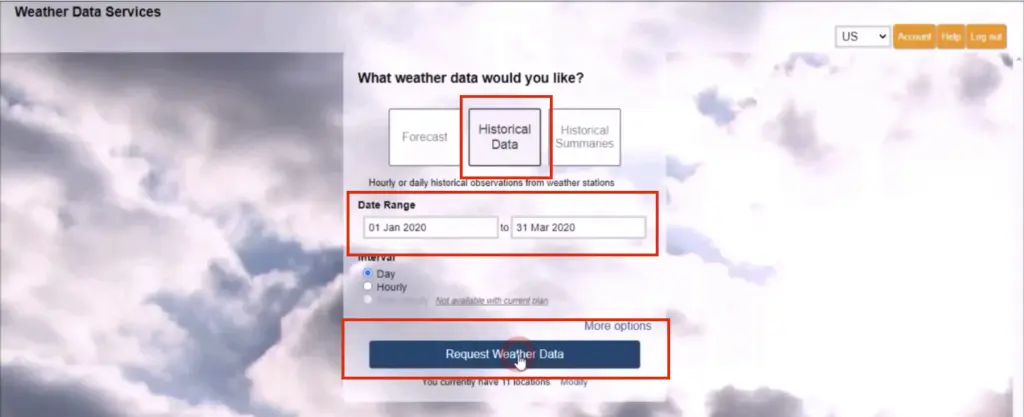 Select the ‘Historical Data’ option, set your date range and click the ‘Request Weather Data’ button.