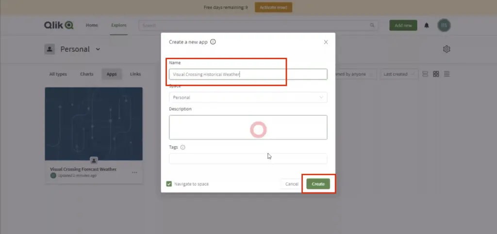 Login to Qlik Sense and select the app you want to add the weather information to or, in case you do not have a suitable app already, create a new one by clicking the ‘Create or upload an app’ button.