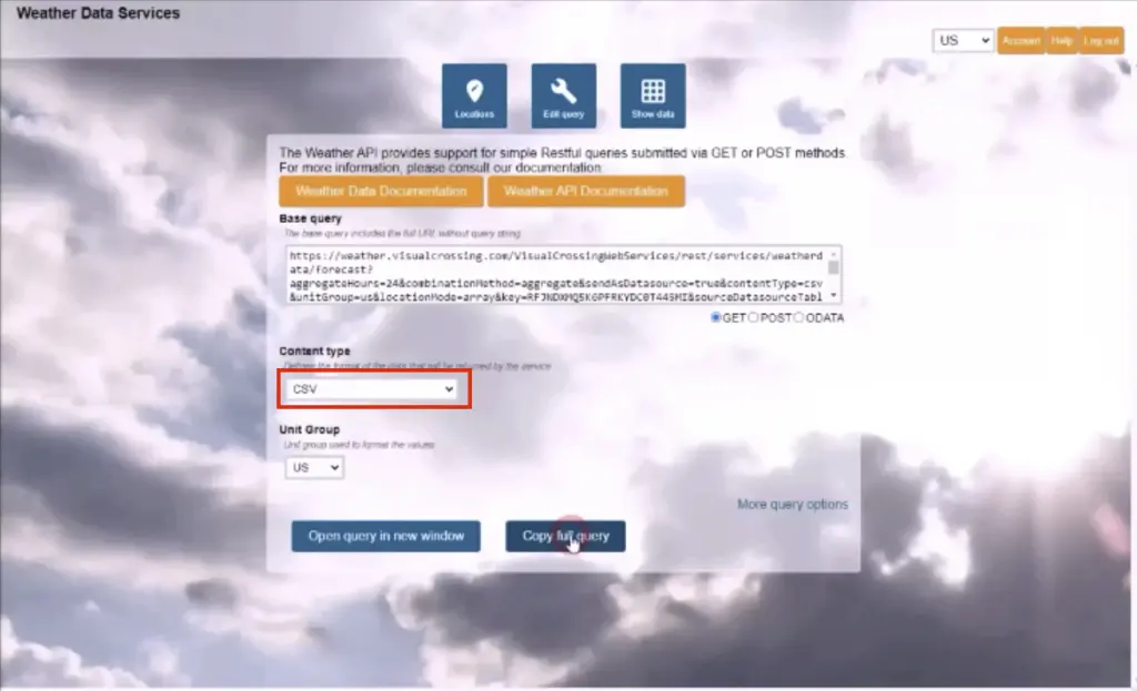 The options are forecast, weather history queries, historical data summary reports, and hourly data. This tutorial will continue with the daily historical option. Please see those or reach out to us if you need more information on the other options or browse our tutorial and video section for more details.