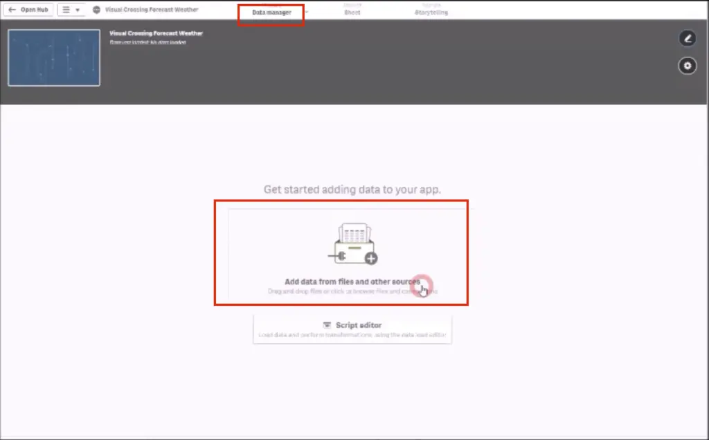 In case of a newly created app click the ‘Add data from files and other sources’ filed. If you have an existing app you can open your ‘Data manger’ from the menu bar as well.